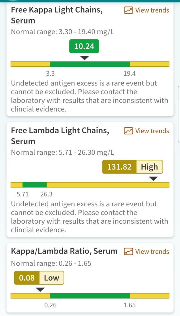 Chart 1: You can see that the middle row, “Free lambda light chains” reads 131.82, far from the normal range of 5.71-26.3.