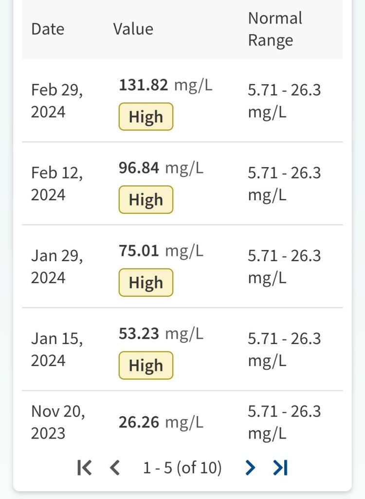 To help visialize, I’ve added two screen shots from the patient portal, which show what his lambda light chains have done the past few months.